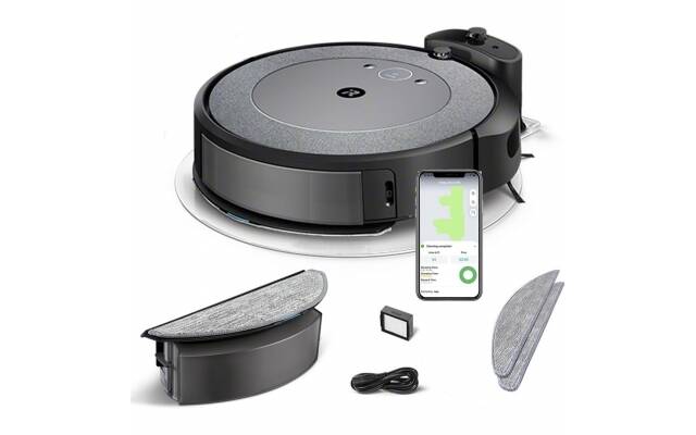 El robot aspirador y trapeador Roomba Combo i5 navega en filas para limpiar a fondo cada habitación.