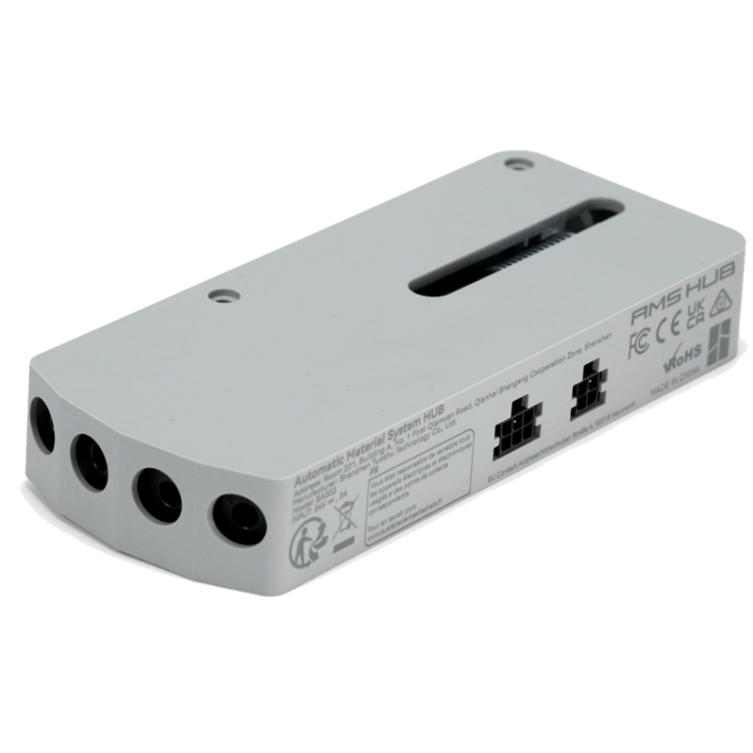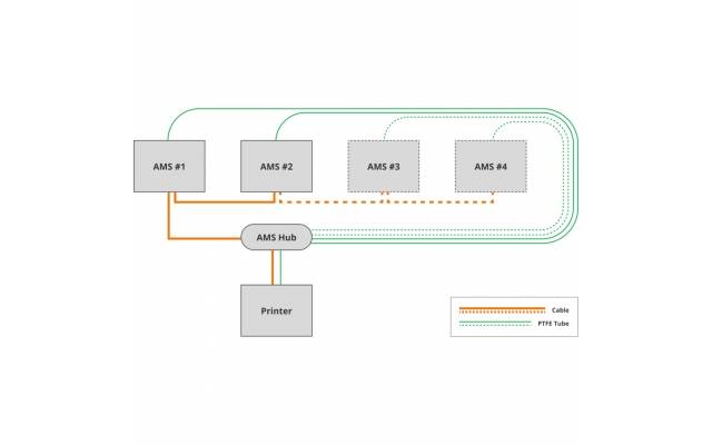 El AMS Hub se utiliza para ampliar la cantidad de unidades AMS conectadas a las impresoras Bambu X1/P1 a un máximo de 4 unidades AMS (16 canales). Esto permite mejorar la velocidad de recarga entre múltiples unidades AMS y ofrece compatibilidad con la redundancia de señal mediante búfer.